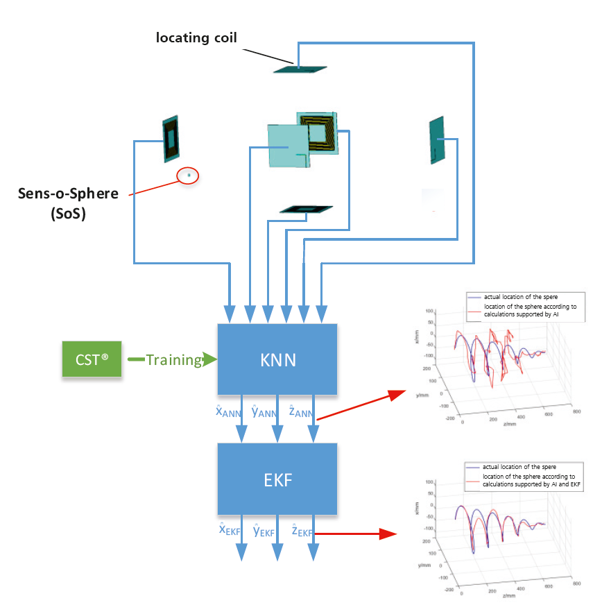 Inductive localization is particularly suitable for the use in bioreactors, where conventional locating technologies such as ultrasound or cameras have high error rates. An externally generated magnetic field induces electrical voltage on the charging coils of the Sens-o-Spheres. There, magnetic fields are generated, which are detected by locating coils. A neural network uses the signal strength to determine the position of the spheres. Equipped with a filter, the AI can take parasitic influences as well as the physical movements taking place in the reactor into account, thus producing reliable and accurate results.